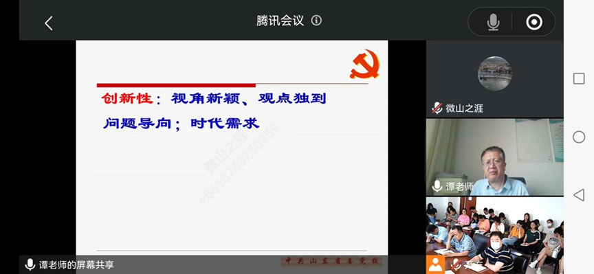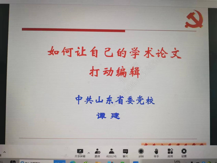 为进一步提高教师高水平学术论文写作能力,6月17日下午,由社会科学处主办、yl88858永利集团承办的“名师大讲堂”第十一场学术报告会,在新城校区豁然楼A315室举行。中共山东省委党校校刊编辑部主任,谭建教授应邀为全校师生作“如何让自己的学术论文打动编辑”的专题报告。报告会由yl88858永利集团院长陶道强教授主持,全校师生100余人通过腾讯会议参加报告会。