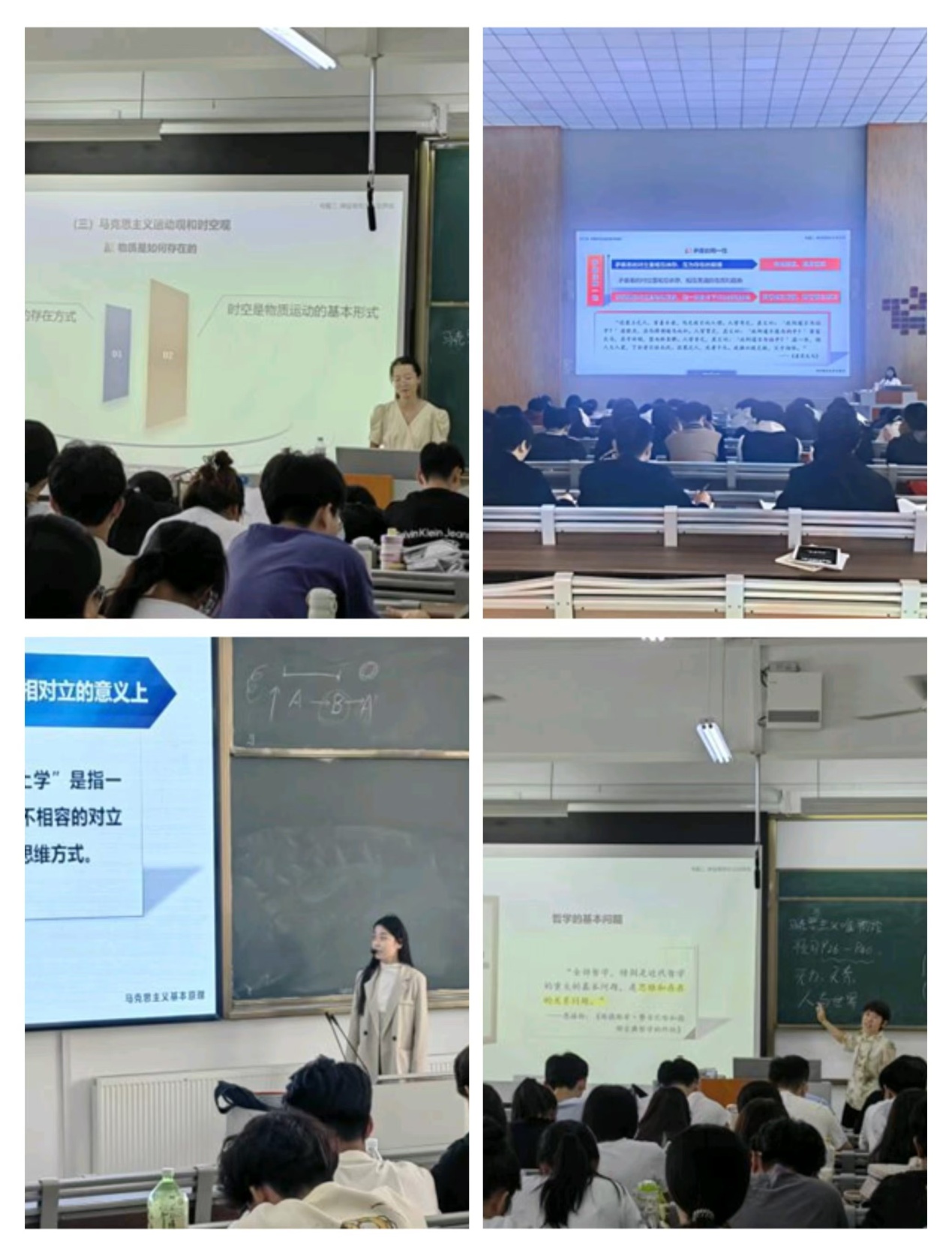 全体人员先后集体观摩了新进教师侯俊霞老师关于马克思主义物质观、刘喆老师关于对立统一规律、徐寒冰老师关于联系和发展的普遍性的现场教学。三位老师作为新进教师,备课充分,教态自然大方,逻辑清晰,语言流畅,案例生动,能够熟练运用智慧教学工具与学生实时互动,收到了良好的教学效果。