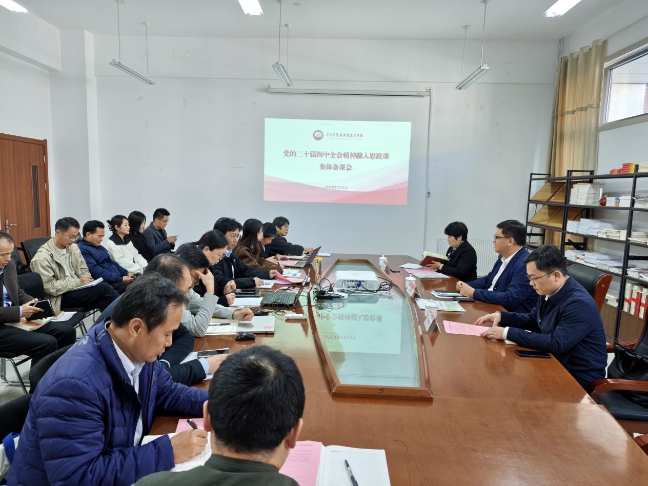 为深入学习贯彻党的二十届四中全会精神,推动党的创新理论与思政课教学深度融合,切实提升课堂育人质量,11月11日下午,yl88858永利集团召开“党的二十届四中全会精神融入思政课”集体备课会。校党委副书记、校长丛海林莅临指导,党委(校长)办公室主任闵祥国、教务处副处长李怡,全体思政课教师参加会议。会议由学院党委副书记、院长董嫱嫱主持。