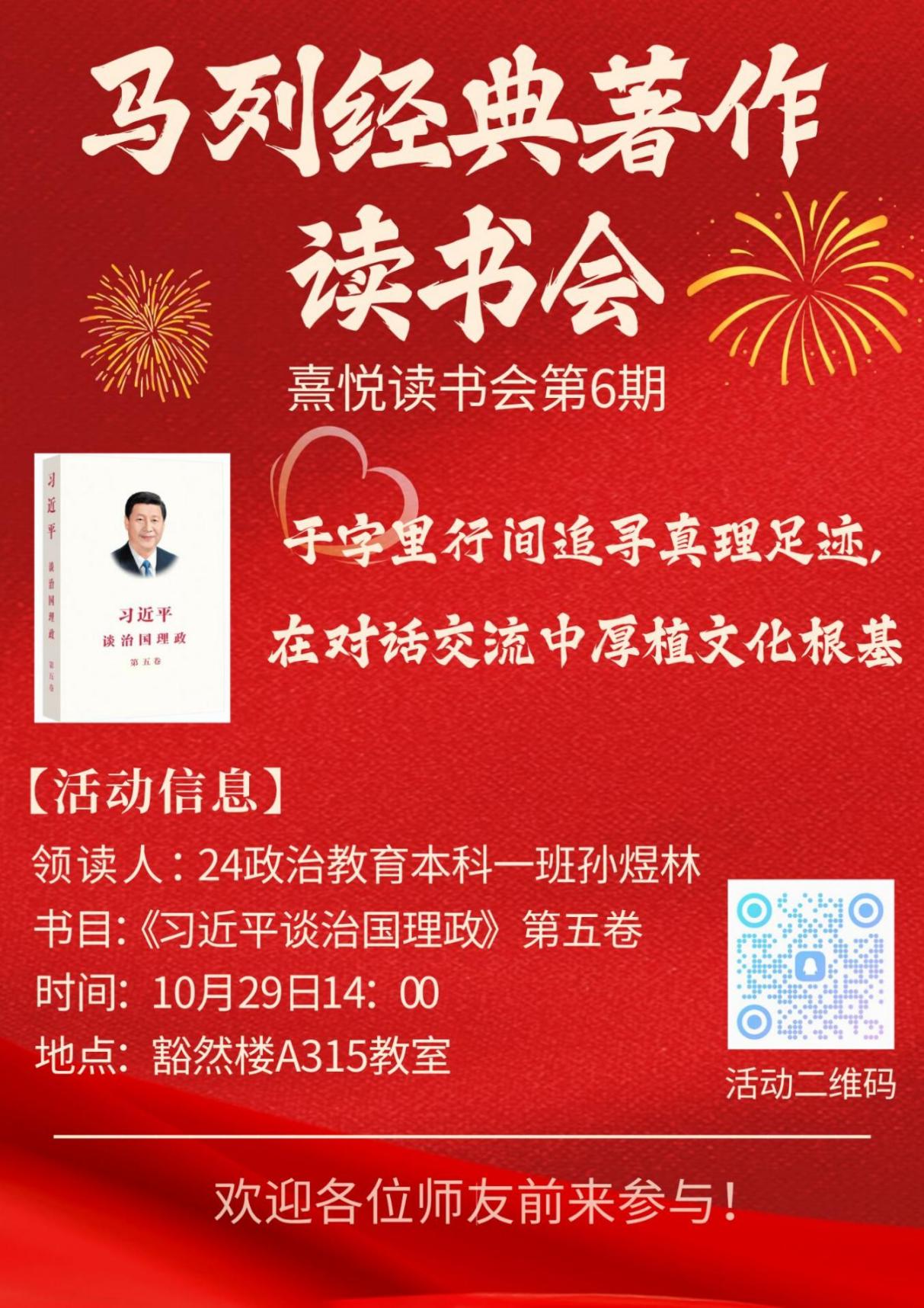 马列经典读书会自2023年创立以来,每学期定期举办,旨在引领马院师生深度钻研马克思主义经典著作,精准把握其核心要义与理论精髓。此次读书研讨会的成功举办,加深了与会师生对《习近平谈治国理政》第五卷内容的理解和把握。读书会也提高了学生多读书、读马列经典的热情和积极性,营造了良好的学习、学术氛围。