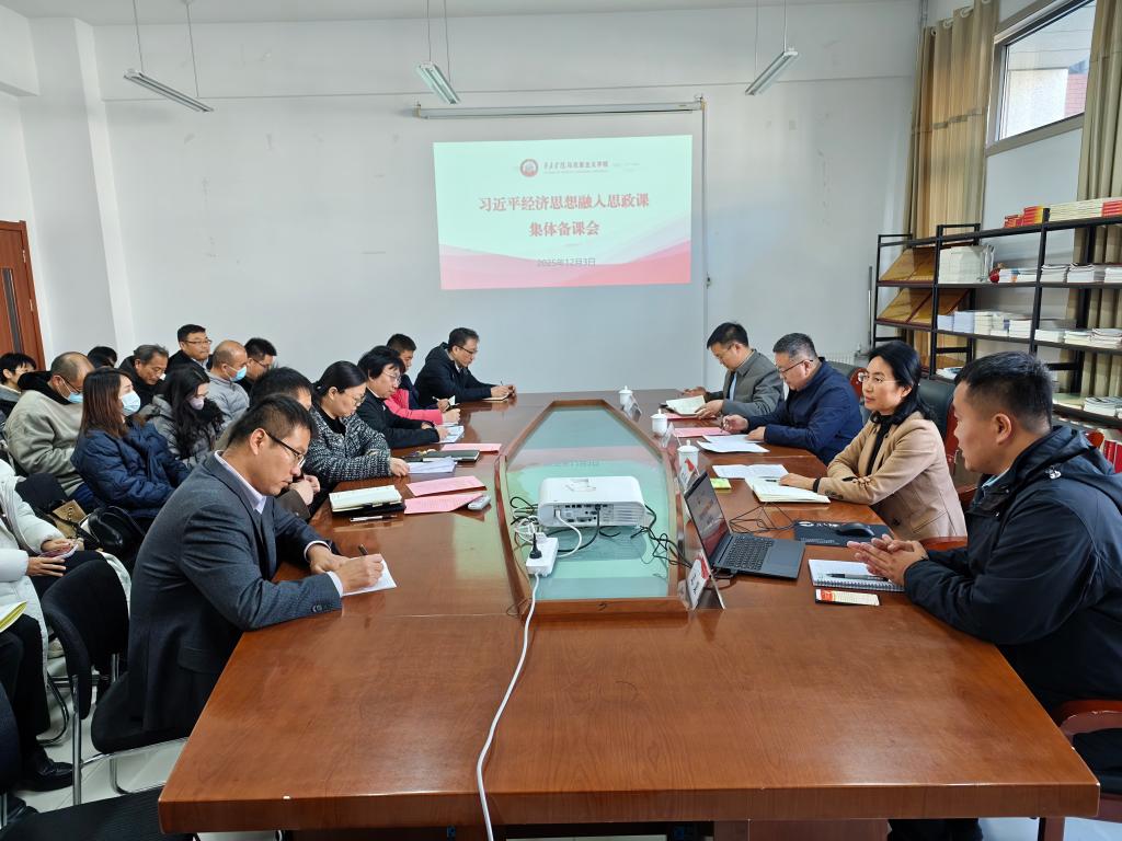 为落实《永利集团思政课课堂教学提升行动方案(2025-2028)》部署要求,提升思政课铸魂育人实效,12月3日下午,yl88858永利集团召开“习近平经济思想融入思政课”集体备课会。校党委副书记丰雷,校党委委员、副校长褚夫敏莅临指导,教务处副处长李宏运,yl88858永利集团党政班子成员、全体思政课教师参会。会议由学院党委副书记、院长董嫱嫱主持。