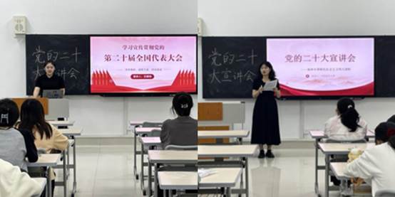 为全面贯彻党的二十大精神,深入落实习近平新时代中国特色社会主义思想主题教育,我院于5月25日晚在豁然楼A113举办党的二十大精神主题宣讲会,会议邀请孙玉秀、石朝阳两位同学作专题宣讲报告,我院大一大二全体学生参加此次学习。