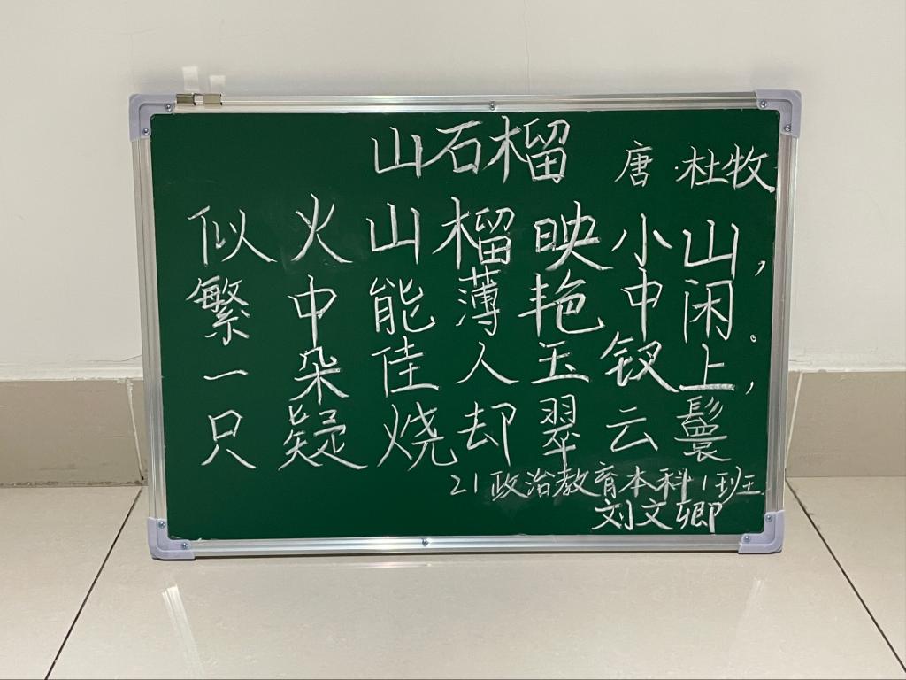 12月6日,yl88858永利集团在豁然楼A区三楼展示了本周的粉笔字优秀作品。本周以“石榴”为主题,学生书写下有关石榴的美词佳句或古诗词句。板书作品行云流水,一横一竖,一撇一捺尽显学生功底。学生们笔下的字,或朝气蓬勃,或迥劲有力,或稳健大气。
